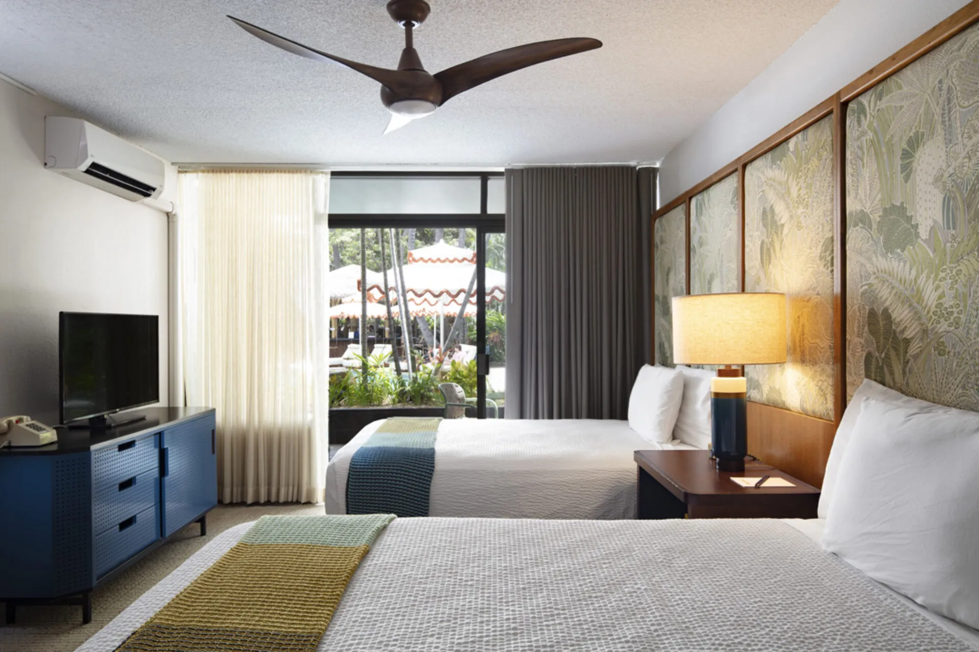 Appreciate understated elegance, joined with vibrant Hawaiian design and local artistic touches. Our Poolside Two Doubles is located on the ground floor, giving you easy access to all the action. After a long day of adventuring, kick back on your intimate bamboo lanai, offering picturesque views of the outdoor pool and lush tropical gardens. Well-appointed rooms feature a minifridge and microwave. Plus a 40-inch LCD TV and high-speed WiFi.